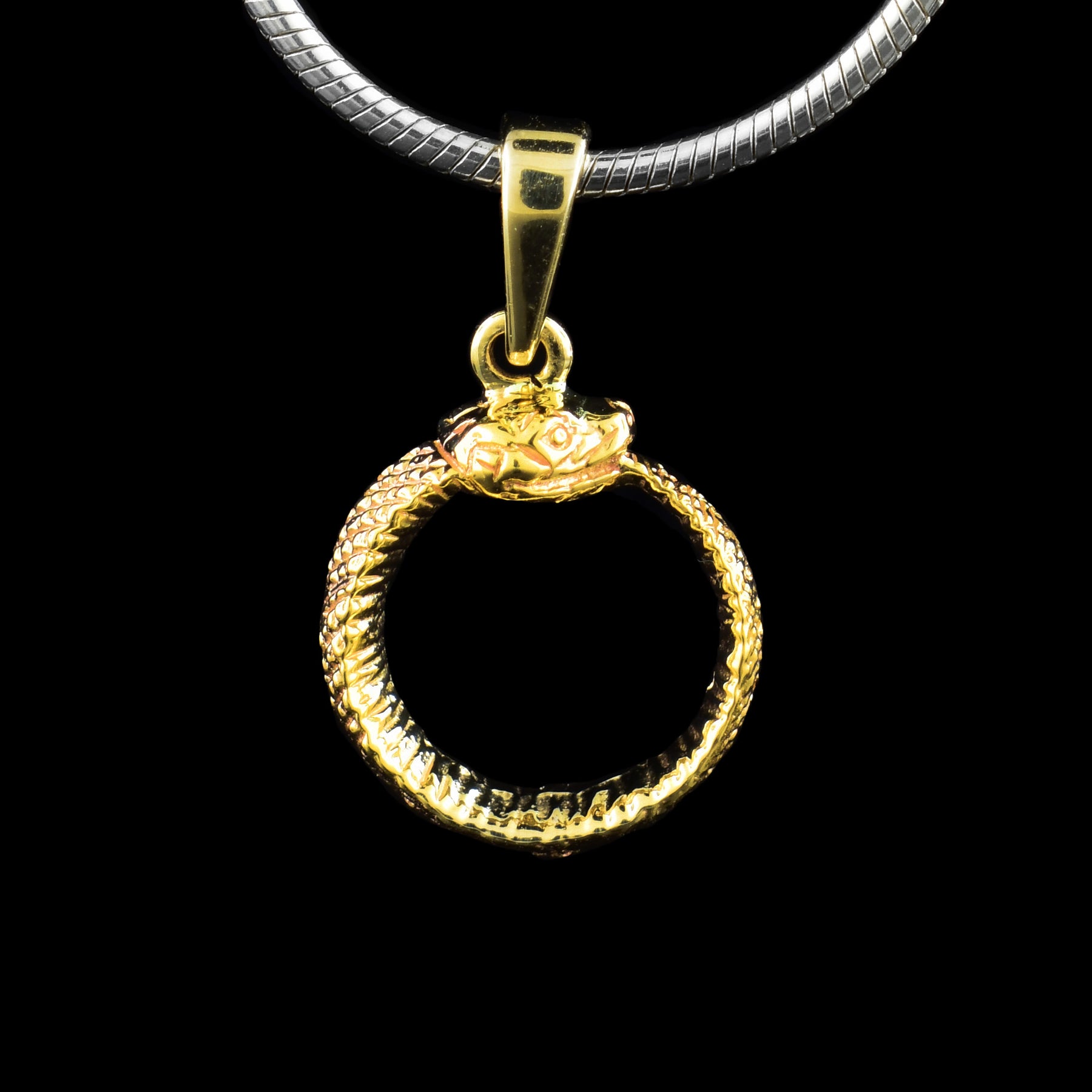 This auroboros snake pendant has been hand crafted by artist Tom Gregorczyk. He has used 10k and 22k gold for the creation of this hoop pendant necklace. The piece depict the auroboros which is an ancient symbol representing renewal, rebirth and the cycle of life and death.
