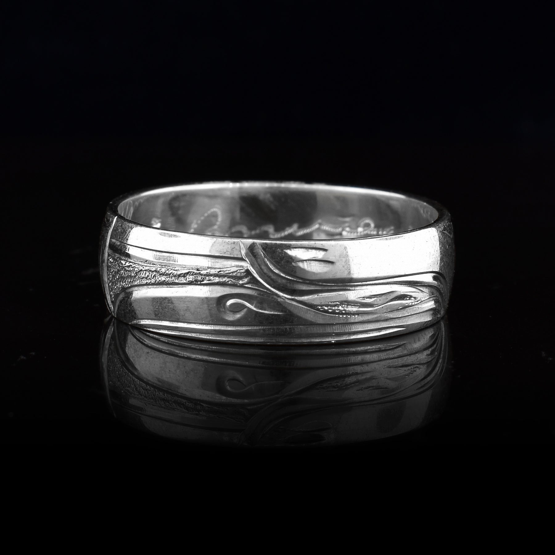 This stunning Raven ring has been hand carved by Kwakwaka'wakw artist Cristiano Bruno. He has used sterling silver to create this simple band ring. There is a depiction of the Raven beautifully carved into the band.
