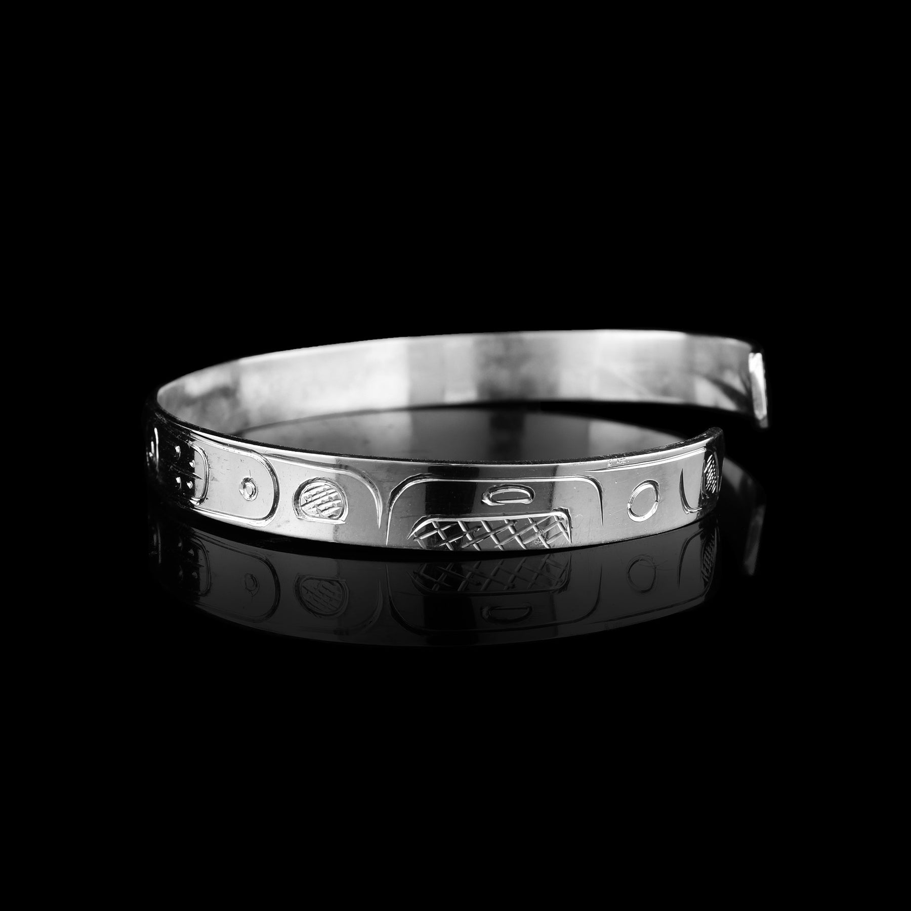 This beautiful 10k gold and sterling silver Raven cuff bracelet has been hand-carved by Coast Salish artist Graham Henry. There is a legend of a Raven that has been carved into the surface of the 10k gold on the band.
