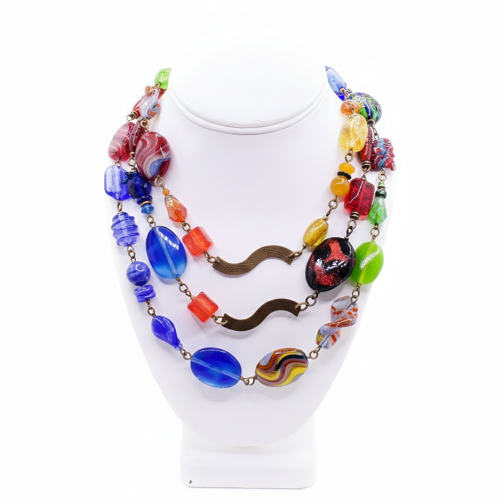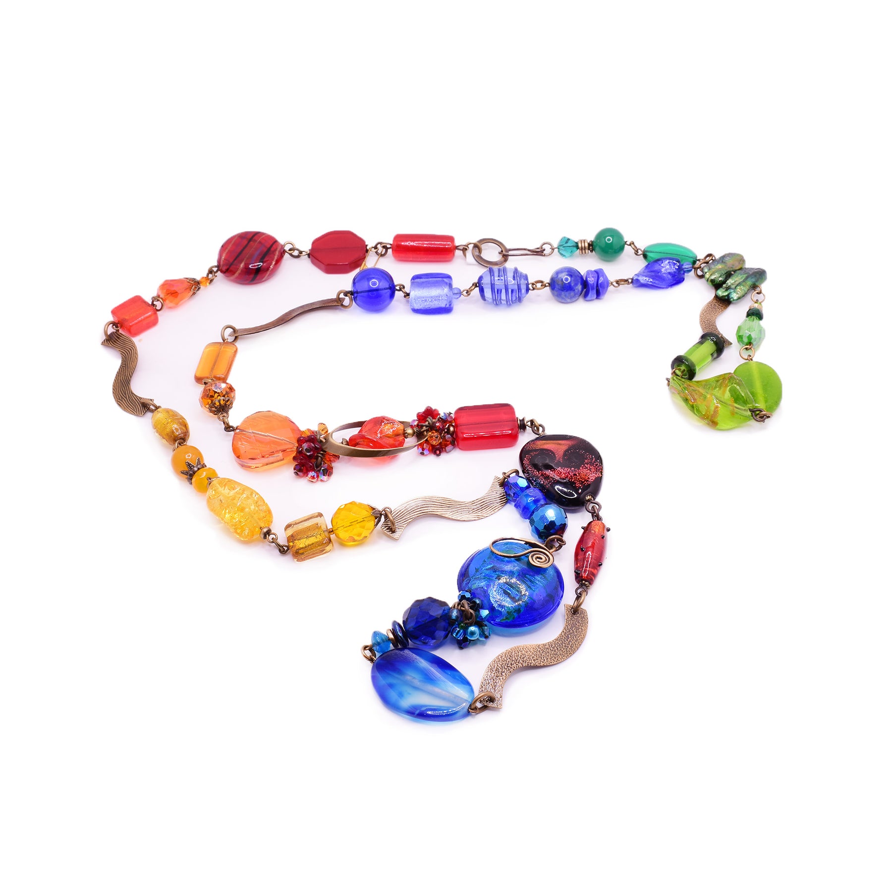 This Galaxy of Colour layered necklace is hand-crafted by artist Honica. The artist has used her signature handworked brass, European glass, lampworked glass, hand-drawn glass, Austrian crystal, polished resins, garnet, and pearl to create this piece.