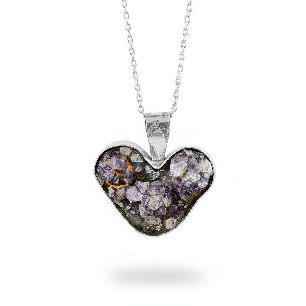 This sterling silver heart necklace showcases a vibrant amethyst gemstone, blending traditional techniques with modern design made by Johanne Rousseau.