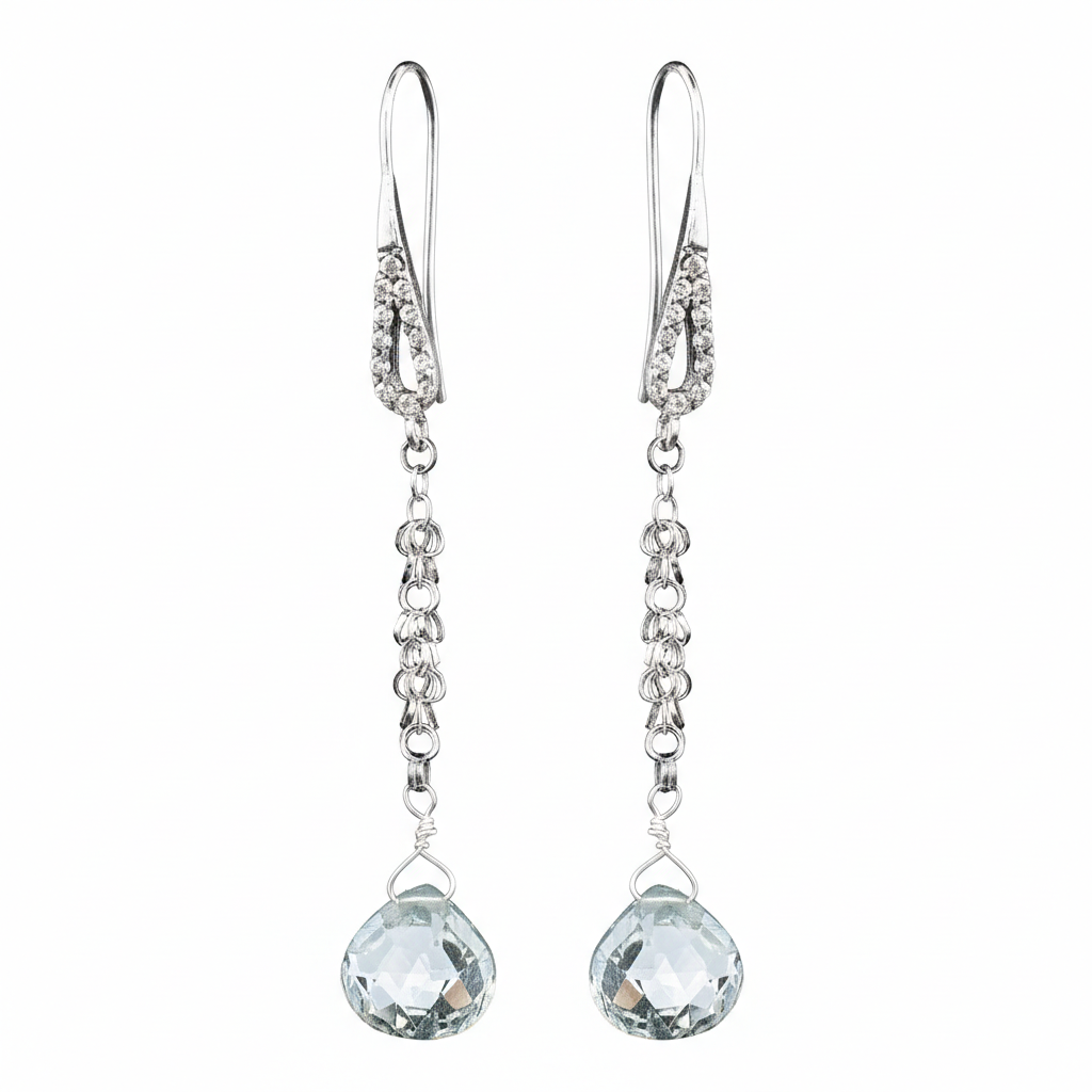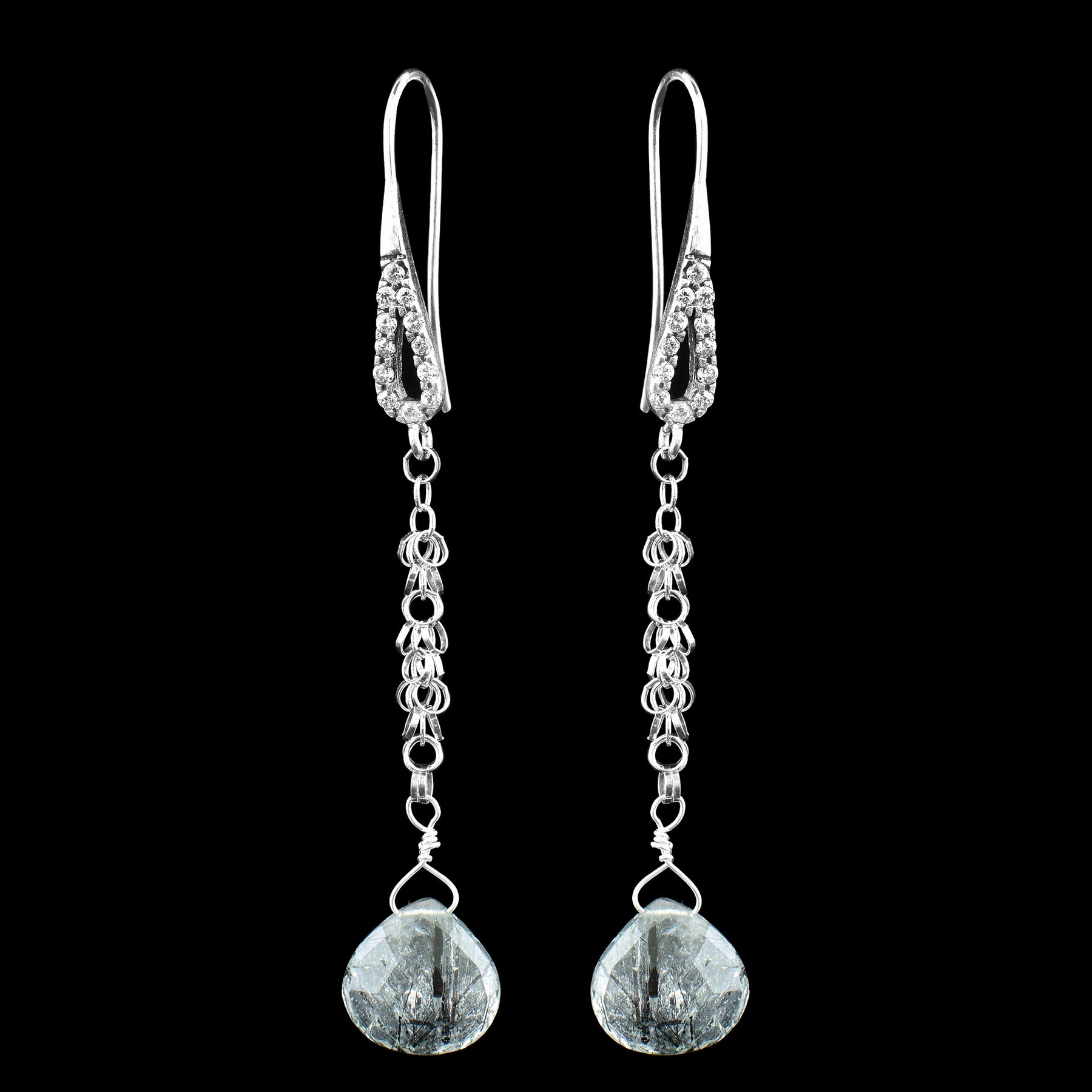 These elegant dangle earrings feature rutilated quartz and sparkling crystals set in sterling silver, each pair meticulously handcrafted by artisan Johanne Rousseau. Earrings measure 3" (7.5 cm) x 1/2" (1.5 cm)