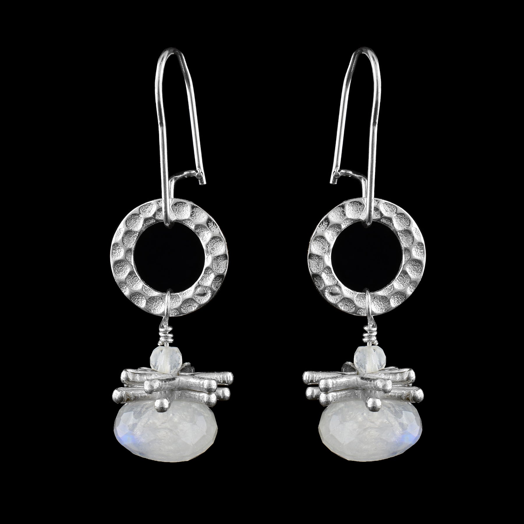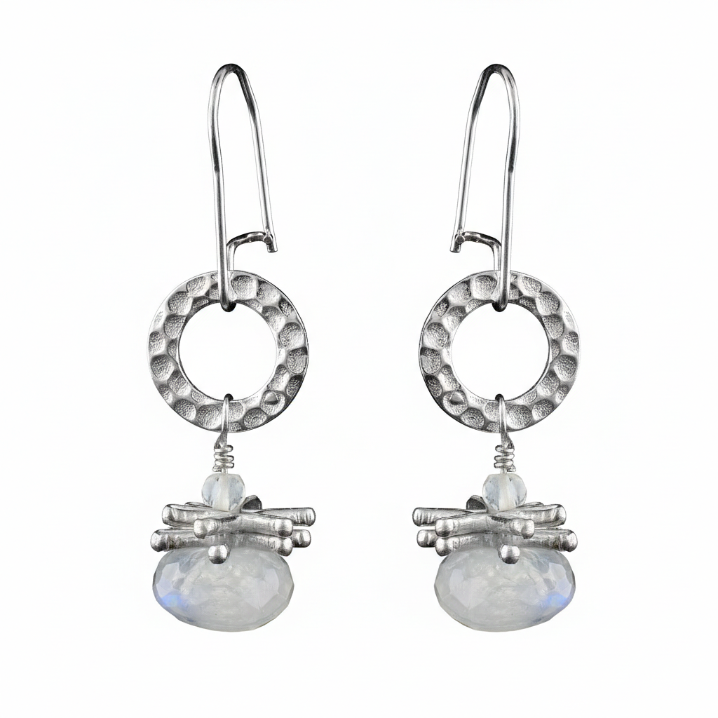 These sterling silver drop earrings have been hand-crafted by Johanne Rousseau. They feature iridescent, moonstone gems that hang from circular, sterling silver hammered circles.Earrings measure 1.75" (4.4 cm) x 0.5" (1.3 cm).