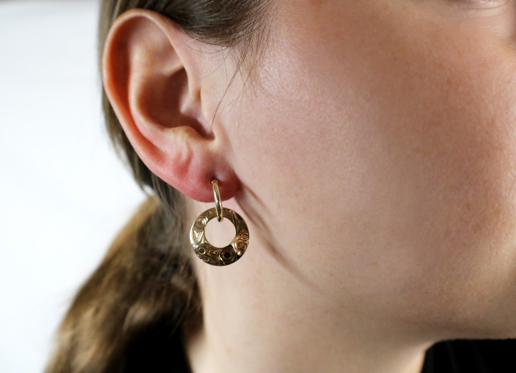 These 14k gold Orca on 10K gold sleeper earrings are hand-carved by Haida artist Jim McGuire. The Orca gold earrings are circular, and a depiction of the orca has been carved into their surface.