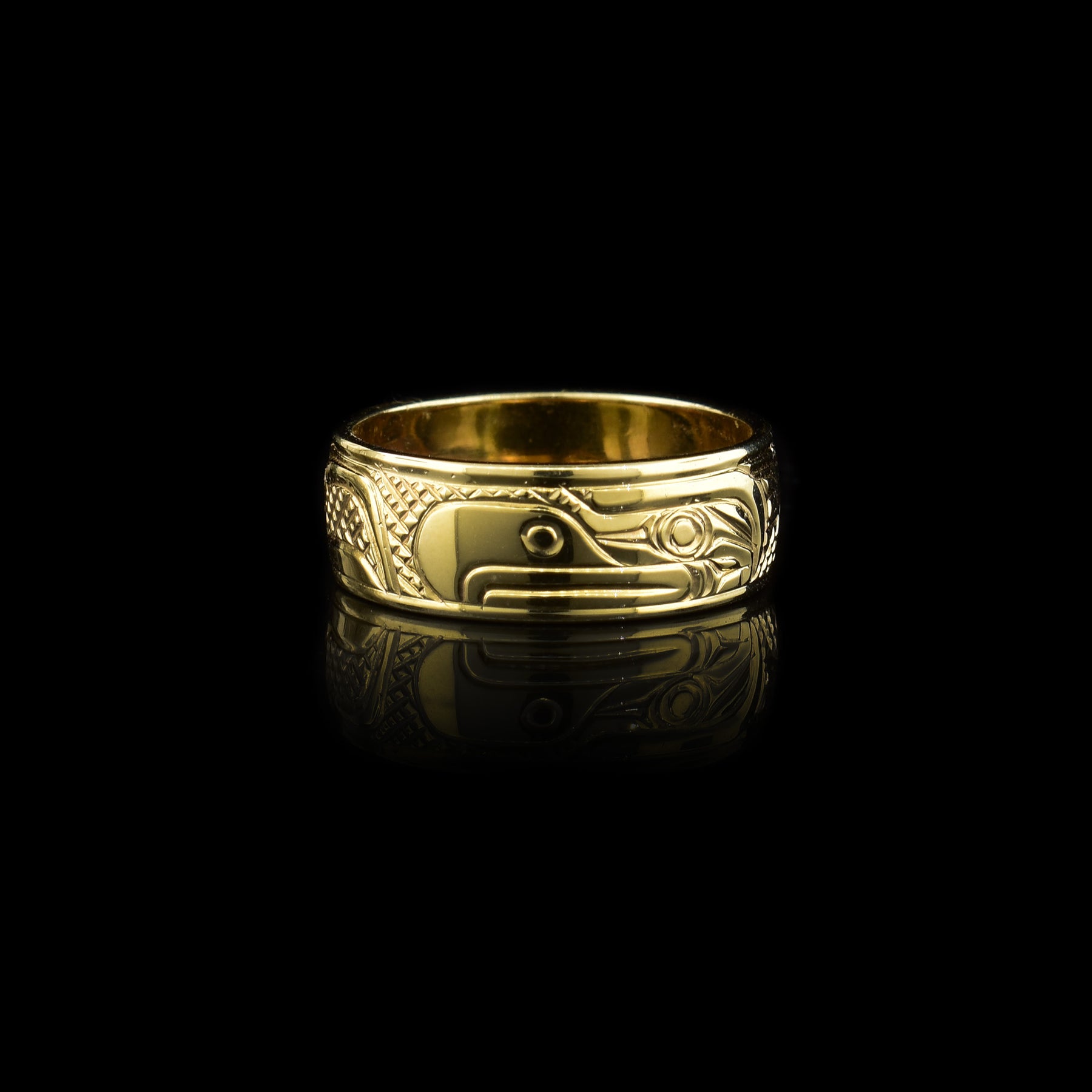 This 14K gold Eagle ring is hand-carved by Kwakwaka'wakw artist Charles Harper, who has intricately inscribed the legend of the Eagle into the 14K gold band.