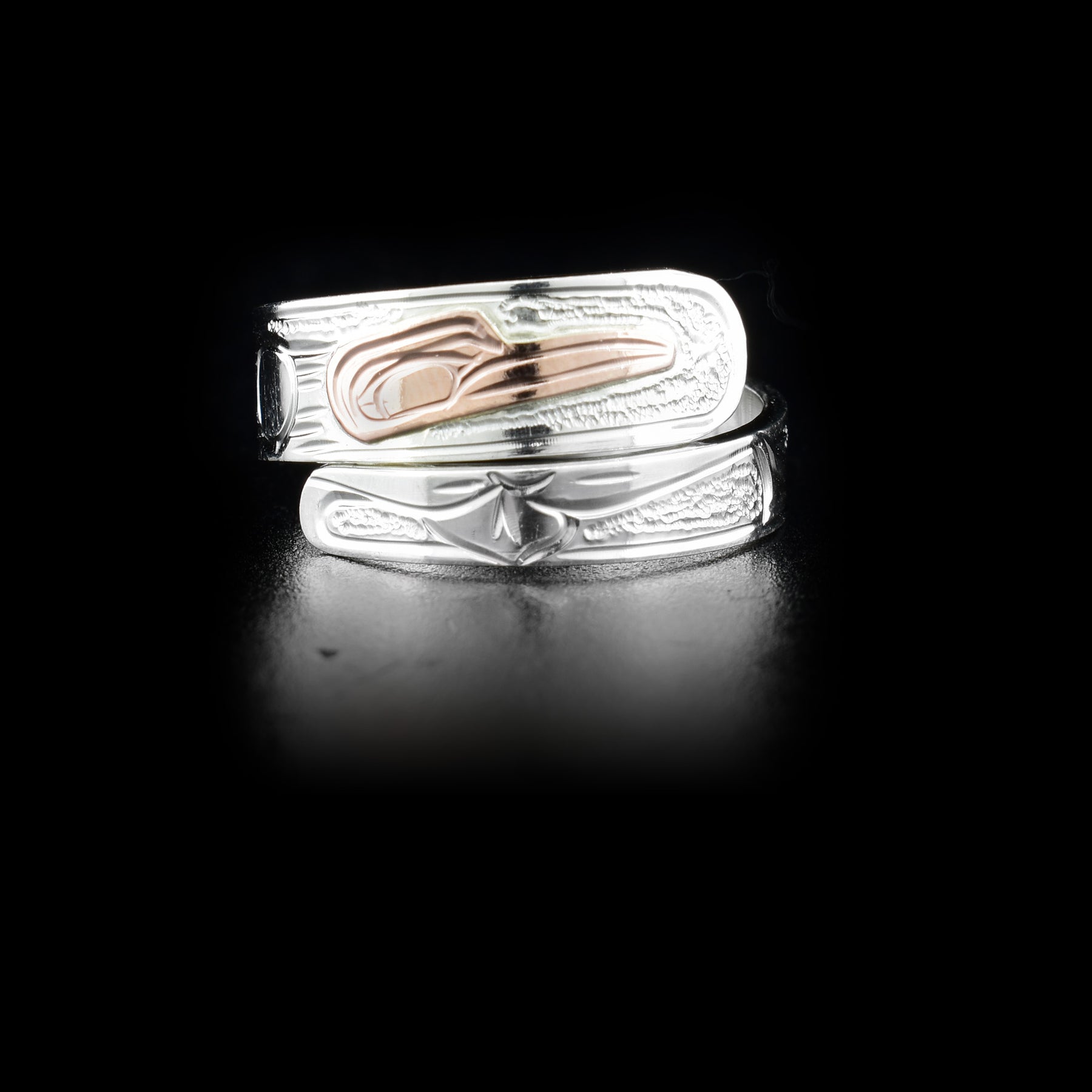 This unique wrap ring is hand-carved by Kwakwaka'wakw artist Victoria Harper. She used sterling silver and 14K rose gold to create it. The band is 1/4" ( 1.5 cm ) at its widest.
