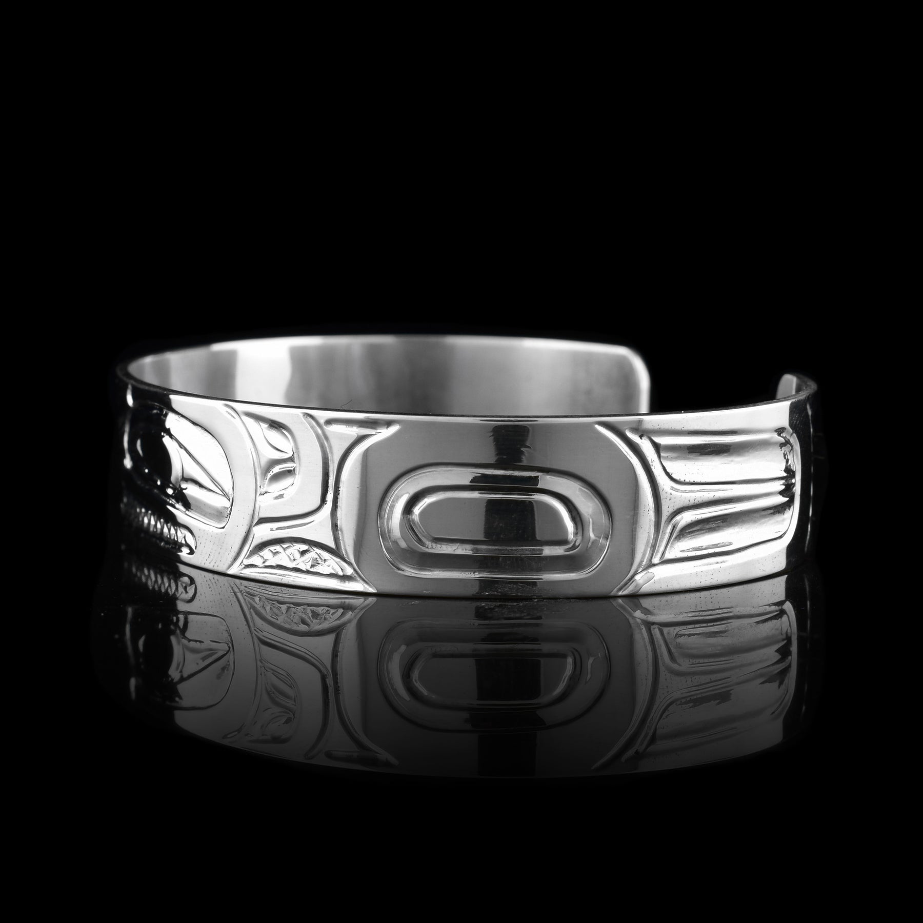 This sterling silver raven cuff bracelet was hand-carved by Kwakwaka'wakw artist Carrie Matilpi. engraved, the design highlights the features of the ravens head and beak.